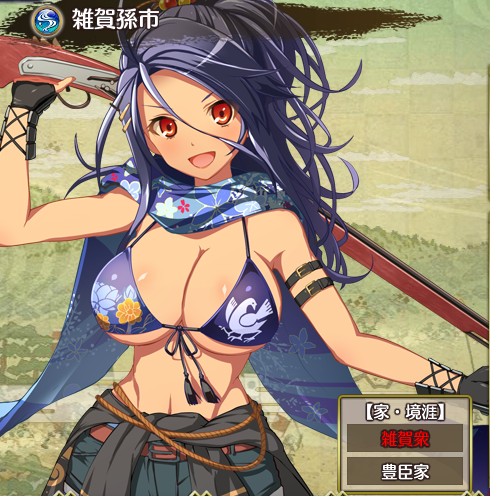 | 本名は鈴木重秀。 「孫市」の称号を持つ、傭兵集団・雑賀衆の頭目。 荒くれ者たちを束ねるに相応しい姉御肌の女として振る舞っているが、実は女の子らしく甘えたがり。 いつか心を射抜いてくれるような男が現れるのを、夢見ている。 | |||||||||||||